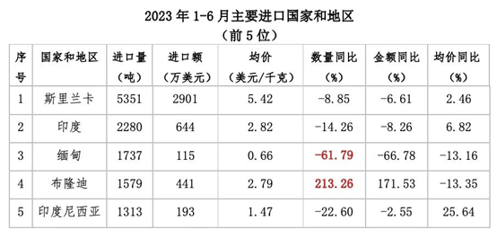 據(jù)海關(guān)統(tǒng)計(jì),2023年1—6月,我國(guó)進(jìn)口茶葉1.73萬(wàn)噸,金額6593萬(wàn)美元,同比分別下降14.41%和6.08%,均價(jià)3.81美元/千克,同比上升9.8%。